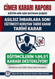 Batman’da gerçekleştirilen anket sonuçları da kararın öğretmenler tarafından desteklendiğini ortaya koyuyor. Ankete katılan 632 eğitim çalışanının %99,5’i kararı desteklerken, %77’si “çok doğru ve yerinde”, %22,5’i ise doğru olmakla birlikte daha da güçlendirilmesi gerektiğini ifade etti. Eğitim-Bir-Sen Şube Başkanı Şehmuz Önlü, açıklamasında, “Asılsız şikâyet korkusuyla eğitim olmaz. Sürekli savunma halinde tutulan, itibarı zedelenen öğretmenden verim beklenemez. Hukukun suskun kaldığı yerde iftira cesaretlenir. Bu karar, o cesareti kıracak güçlü bir adımdır” dedi. Önlü, alınan kararın yalnızca öğretmenleri değil, eğitim sistemini, kamu kaynaklarını ve toplumsal adalet duygusunu da koruduğunu belirterek, “Asılsız şikâyetlerle açılan her soruşturma hem kamu kaynaklarını israf eder hem de gerçek sorunların üzerini örter. CİMER’in amacı dışına çıkan herkes yaptırımla karşılaşmalıdır” ifadelerini kullandı. Eğitim-Bir-Sen, öğretmenlere yönelik itibar suikastları, mobbing ve şiddet tamamen sona erene kadar mücadeleyi kararlılıkla sürdüreceklerini duyurdu.