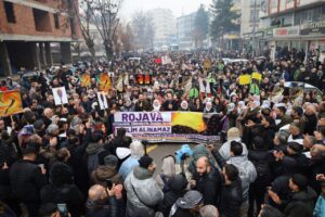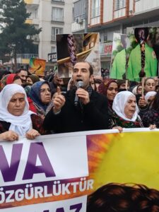 DBP Eş Genel Başkanı Keskin Bayındır, dünya genelinde yaklaşık 60 milyon Kürt’ün varlığını sürdürdüğünü belirterek, milyonlarca insanın Rojava’nın özgürlüğü için mücadele ettiğini söyledi. Bayındır, Halep’ten Rakka’ya uzanan bölgede insanlık dışı saldırıların sürdüğünü vurguladı. Bu saldırıların DAİŞ zihniyetiyle ve Şam hükümeti adı altında yürütüldüğünü savunan Bayındır, süreçte Golani ve HTŞ güçlerinin yanı sıra arka planda farklı güçlerin de bulunduğunu iddia etti. Bayındır, “Kürt halkı yürütülen politikanın farkında. 7 yaşındaki çocuklardan 90 yaşındaki annelere kadar herkes bu ‘kirli siyaseti’ görüyor. Suriye’de izlenen politika Kürtlere yönelik bir soykırım amacını taşıyor. Özellikle Kürt kadınlar ve çocuklar hedef alınıyor” dedi. “Kardeşlik” söylemlerine de değinen Bayındır, bu anlayıştaki bir kardeşliği kabul etmediklerini belirterek mücadeleyi sürdüreceklerini söyledi. Yapılan konuşmaların ardından kitle, sessiz bir şekilde dağıldı.